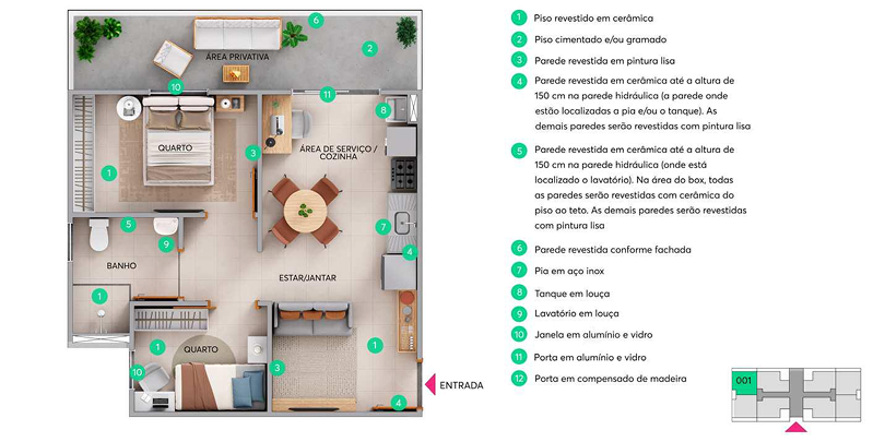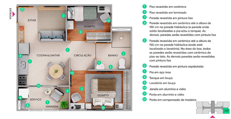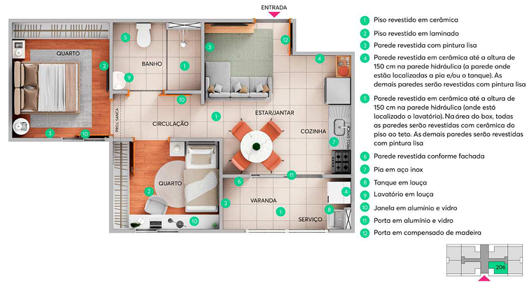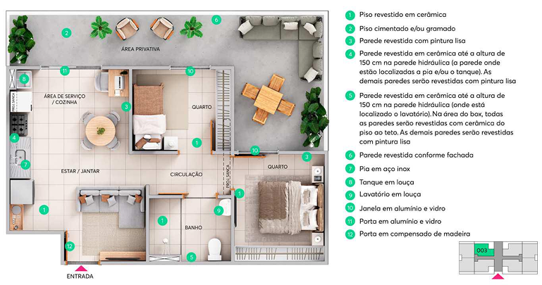 A cozinha vem com pia em inox e as paredes hidráulicas são revestidas com cerâmica. O banheiro possui lavatório em louça e o box é revestido em cerâmica do piso ao teto. Além disso, a MRV oferece o Kit Acabamentos através da linha Exclusivitá, permitindo que o cliente personalize o seu lar com opções de acabamentos diferenciados.